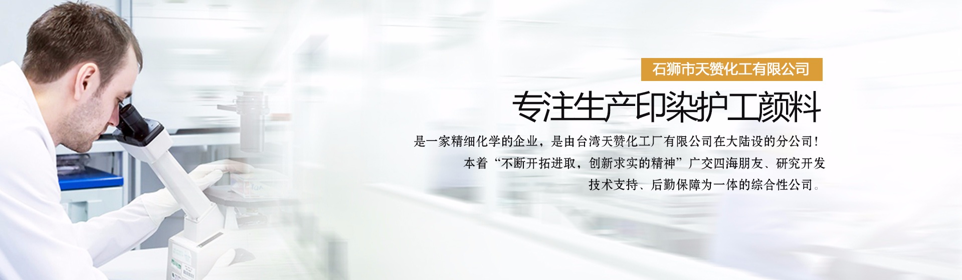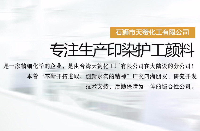 石獅市天贊化工有限公司是一家生產(chǎn)印染護工顏料的公司,是一家精細化學的企業(yè),是由臺灣天贊化工廠有限公司。在大陸設(shè)的分公司!本著“不斷開拓進取,創(chuàng)新求實的精神”廣交四海朋友、研究開發(fā)、技術(shù)支持、后勤保障為一體的綜合性公司。二十年來,我們對紡織,前處理,后整理,技術(shù)的研究實踐中體會得經(jīng)驗。